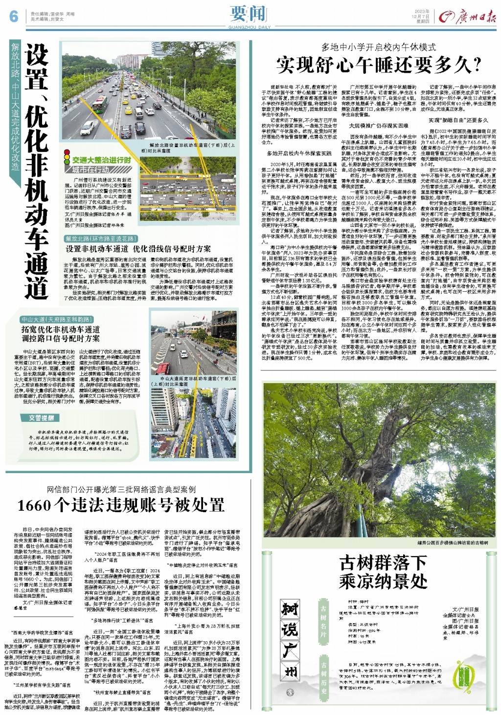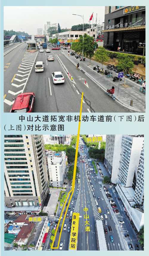 经充分研究,相关部门对中山大道进行了优化改造,通过压缩机动车道宽度,并将最右侧机动车道改为非机动车通道,设置机非分隔护栏和示警桩;优化荷光路口、上社横街路口等路口的非机动车通道,配套设置非机动车指引标志,保持非机动车通道的连贯性;精细化调控路口的信号配时方案,保障交叉口各时段各方向车流平衡,保障交通安全有序。