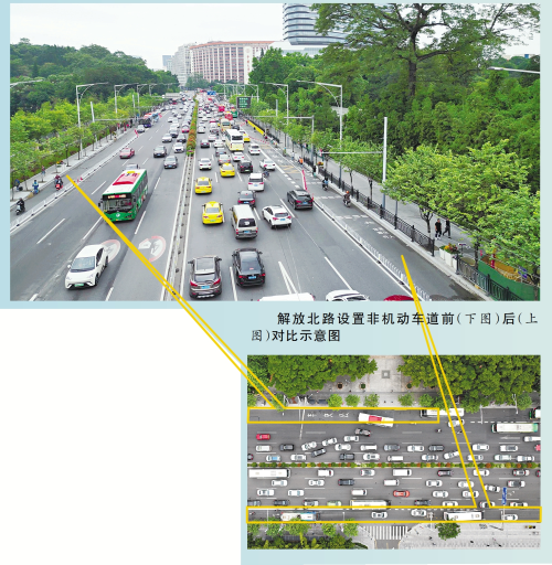 经实地研究,相关部门对解放北路实施了优化改造措施:压缩机动车道宽度,并将最右侧机动车道改为非机动车通道,设置机非分隔护栏和示警桩。同时,优化非机动车通道与公交站台的设施,保持非机动车通道的连贯性。