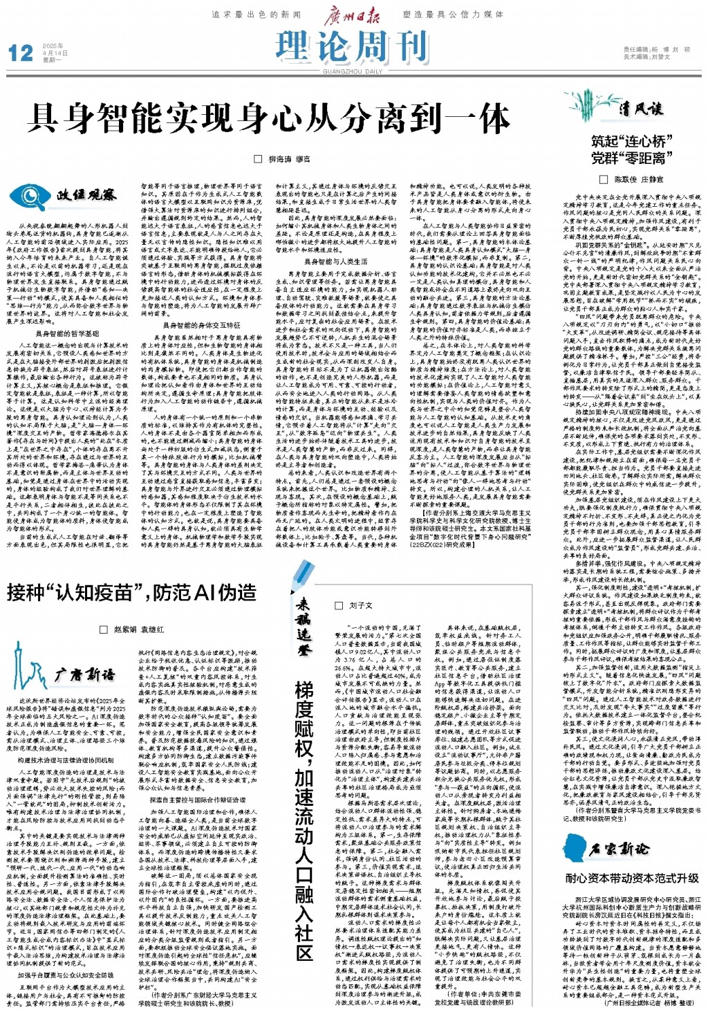 离身智能主要用于完成数据分析、语言生成、知识管理等任务。若需让离身智能具备自主适应环境的能力,如实现机器人助理、自动驾驶、灾难救援等场景,就要使之具备肢体的行动能力。这就需要在具身学习和数据学习之间找到最佳结合点,来提升智能水平,应对复杂的社会应用场景。在技术进步和社会需求的双向促动下,具身智能的发展趋势已不可逆转,人机共生的混合场景将成为常态。技术不只是一种工具,当人们使用技术时,技术会与应用的场域相结合而生成新的社会现实,从而深刻改变人自身。具身智能的目标不是为了让机器做出炫酷的动作,也不是创造完美的人形机器,而是让人工智能成为可用、可靠、可控的行动者,从而安全地进入人类的行动网络。从人类的智能特征来看,真正的智能从来不是冰冷的计算,而是身体与环境的互动、经验以及情感的交织。当机器能够感知疼痛、学习共情,它预示着人工智能将从“计算”走向“交互”,从“数字孤岛”迈向“物理共生”。人类生活的进步始终伴随着技术工具的进步,技术是人类智慧的产物,而非反过来。同样,在人类与具身智能的双向塑造中,人类将始终是主导者和创造者。
