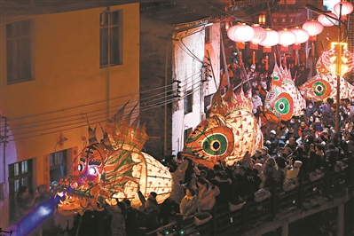 闪闪发光的大鱼,从古镇的街道上游过,红白相间的鳞片翕张,鱼身不时摆动。大鱼眼睛是绿色的,散发着莹莹的光,鱼头上还有一个清晰的“王”字。鱼背上有高耸的背鳍,放射状的尖角尤为威武。在鱼腹下有一簇人影闪过,他们托举着大鱼,恰似一丛涌动的黑色波浪。