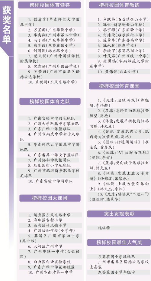 颁奖典礼上,10支校园体育队伍、10位体育老师、10位学生健将、10所学校的体育大课间、10节优秀体育课和一位为校园体育做出突出贡献的老师,分别获得表彰。另外,经过线上点赞,“榜样校园体育之队”“榜样校园体育教练”“榜样校园体育健将”这3个奖项中,各有一个团队或个人获得“榜样校园最佳人气奖”。