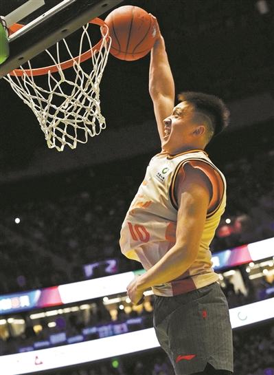 获得全明星正赛MVP的北区明星队球员阿不都沙拉木(右)在比赛中上篮。@新华社