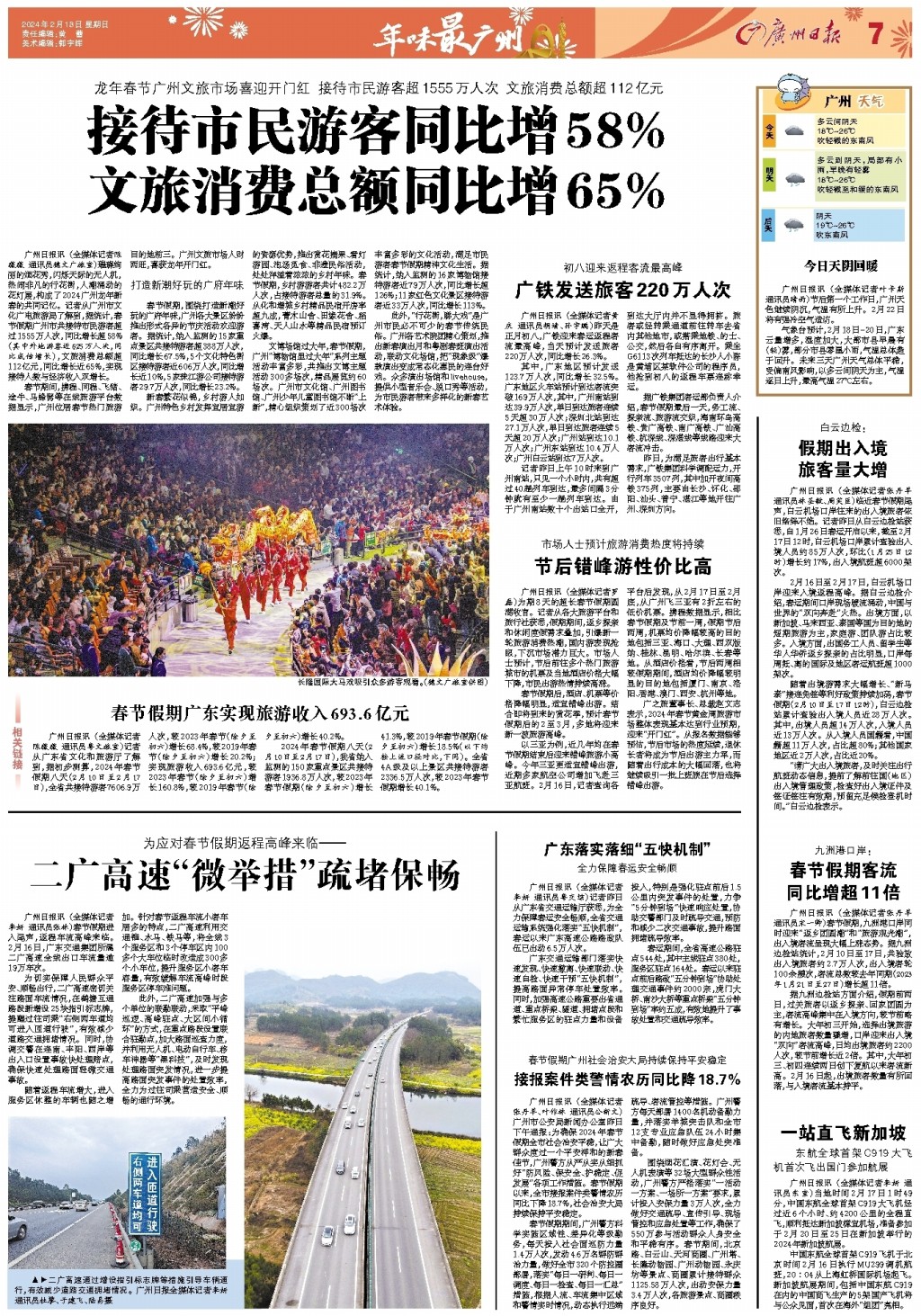广州日报讯 (全媒体记者李妍 通讯员张林)春节假期进入尾声,返程车流高峰来临。2月16日,广东交通集团所属二广高速全线出口车流量逾19万车次。