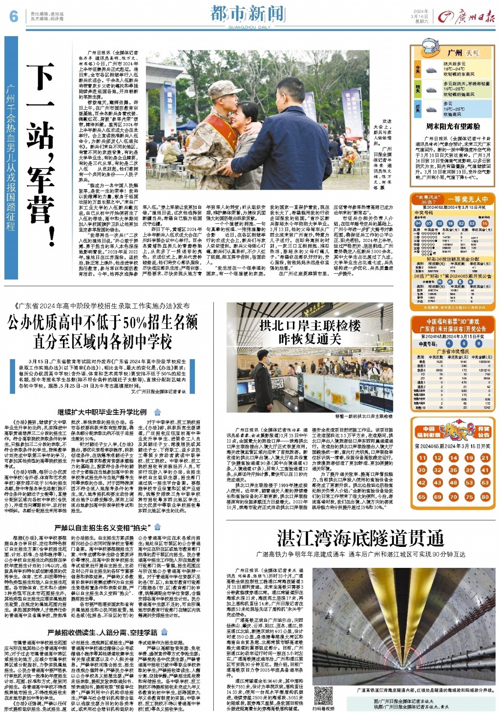 3月15日,广东省教育考试院对外发布《广东省2024年高中阶段学校招生录取工作实施办法》(以下简称《办法》),相比去年,最大的变化是,《办法》要求:每所公办优质高中学校(含外语、体育和艺术类学校)要安排不低于50%的招生名额,按中考报名学生总数(除不符合条件的随迁子女数等),直接分配到区域内各初中学校。据悉,5月25日-31日为中考志愿填报时间。