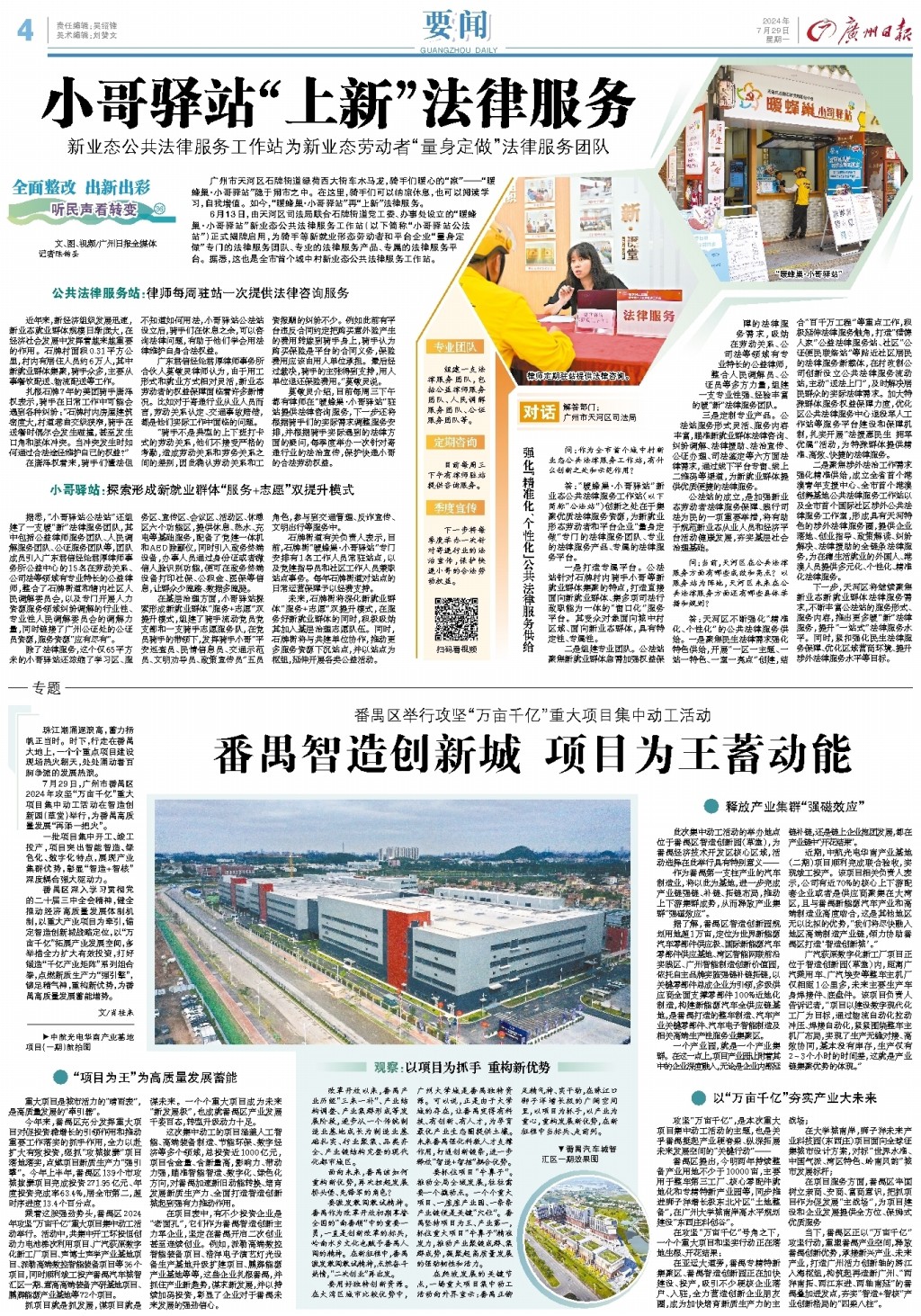 在项目服务方面,番禺区牢固树立亲商、安商、富商意识,把抓项目作为促发展“主战场”,为项目建设和企业发展提供全方位、保姆式优质服务……