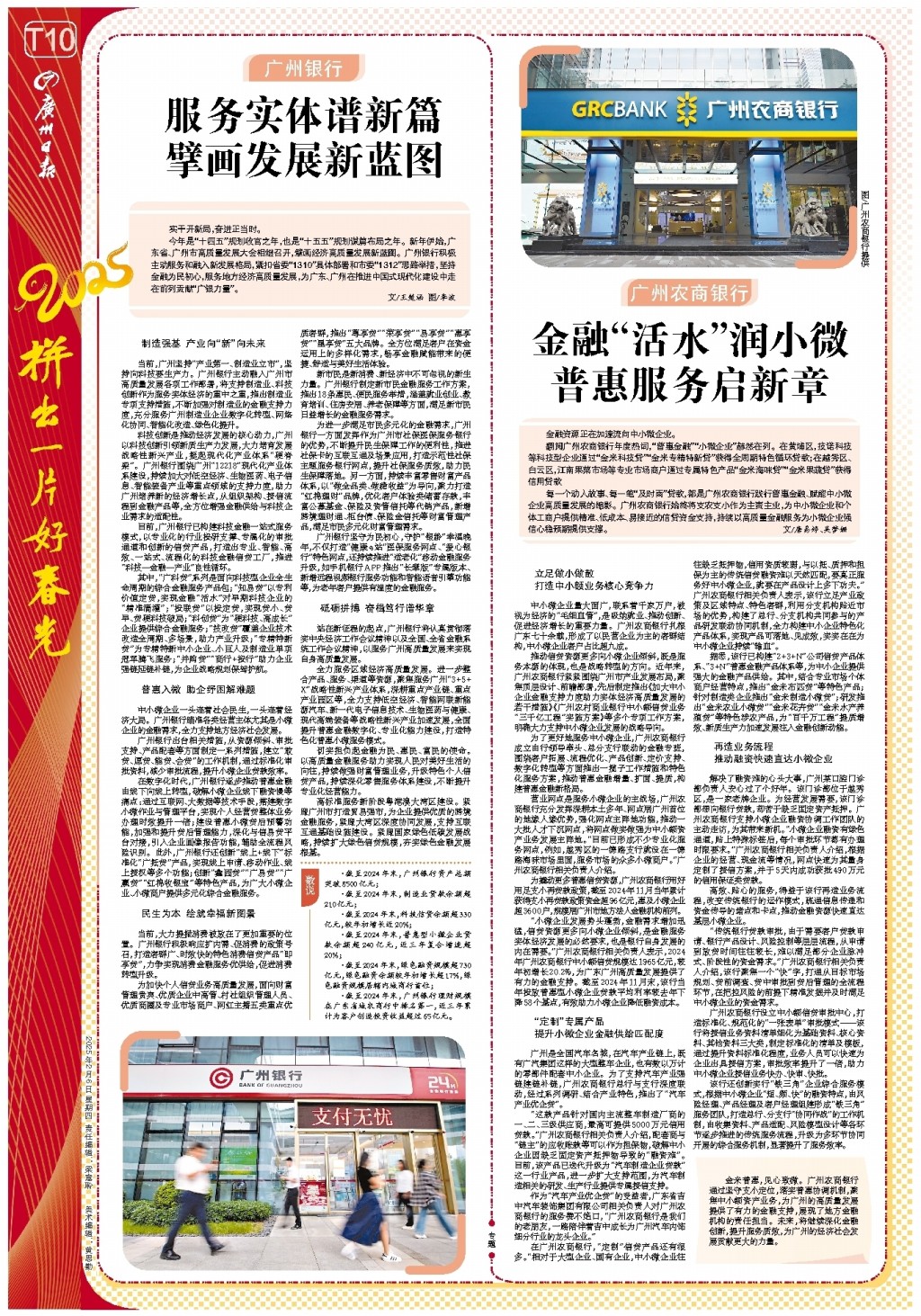 全力服务区域经济高质量发展。进一步整合产品、服务、渠道等资源,聚焦服务广州“3+5+X”战略性新兴产业体系,深耕重点产业链、重点产业园区等,全力支持低空经济、智能网联新能源汽车、新一代电子信息技术、生物医药与健康、现代高端装备等战略性新兴产业加速发展,全面提升普惠金融数字化、专业化能力建设,打造特色化普惠小微服务模式。