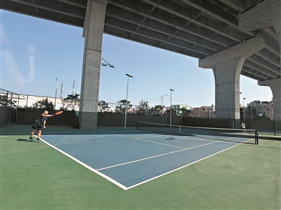 在海珠区新化快速路北段高架桥下的一个运动场内,尽管不是休息日,但羽毛球场、网球场上都有“发烧友”在切磋技艺。